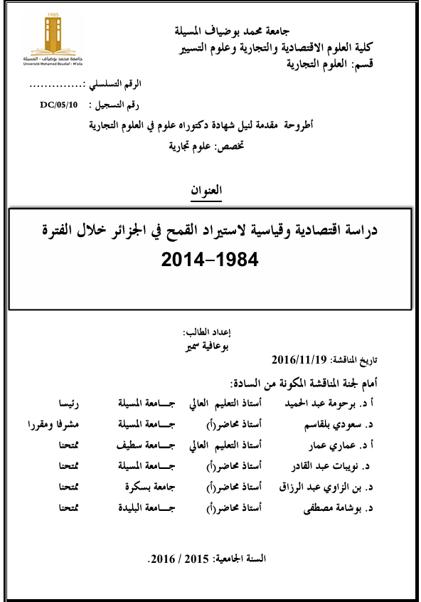 دراسة إقتصادية وقياسية لإيستيراد القمح في الجزائر خلال الفترة 1984-2014 = Analytical Study of The Hidden Economy in Algeria [texte imprimé] / بوعافية سمير, Auteur ; سعودي بلقاسم, Autre . - جامعة محمد بوضياف المسيلة, 2016-2015 . - 927 ص : جداول،أعمدة بيانية ،منحنيات ; 20*30. واردات القمح(1984-2014)؛ دراسة قياسية؛دراسة تنبؤية Langues : Arabe ( ara) Langues originales : Arabe ( ara)